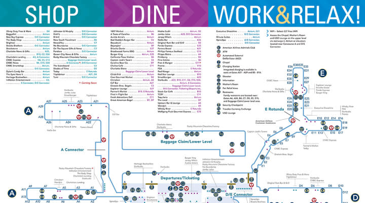 - CLT consiste en un edificio de terminales que conecta cinco salas (A-E) como se muestra en el mapa de la terminal.